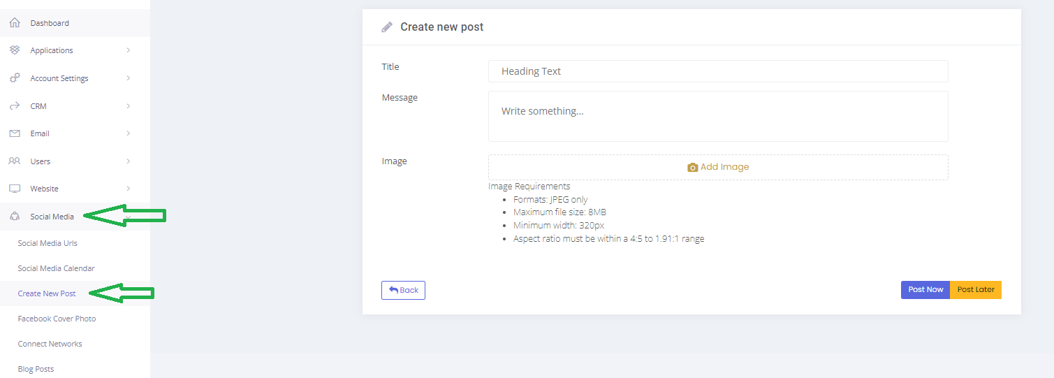 Creating Your Own Blog Post Technical Support Team Updated February 28, 2024 17:45 Follow Video Guide Step-by-step Guide Log onto your LSX dashboard Go to Social Media -> Create New Post Put in a Title, Message, and Image Choose whether to Post Now or Post Later Related articles Blogs Are Not Automatically Posted In Social Media Connecting Your Social Media Accounts Uploading a picture or image to your website Adding Custom Apply Link To Your Website Update Change Credit Card Billing Information Comments 0 comments Article is closed for comments.