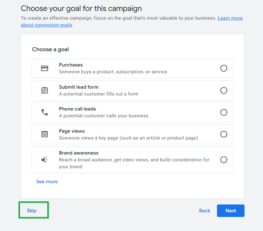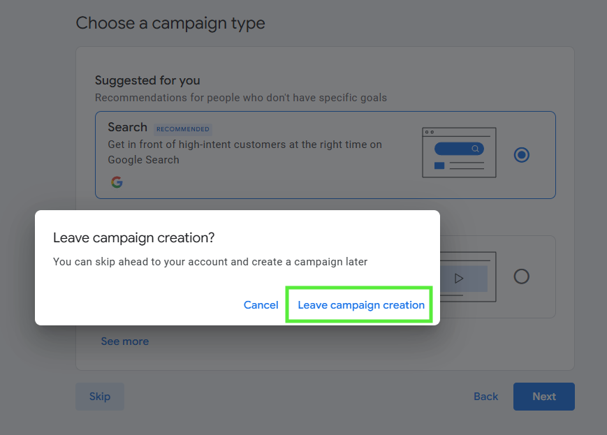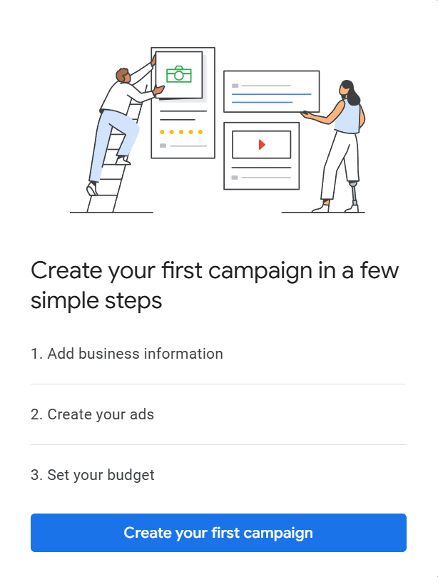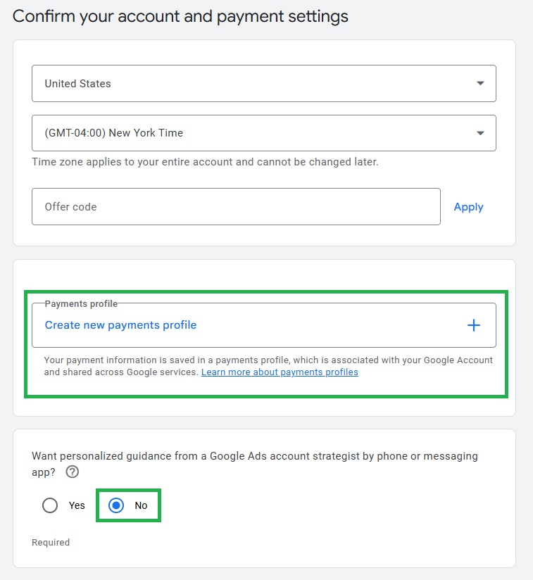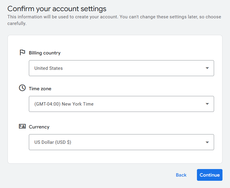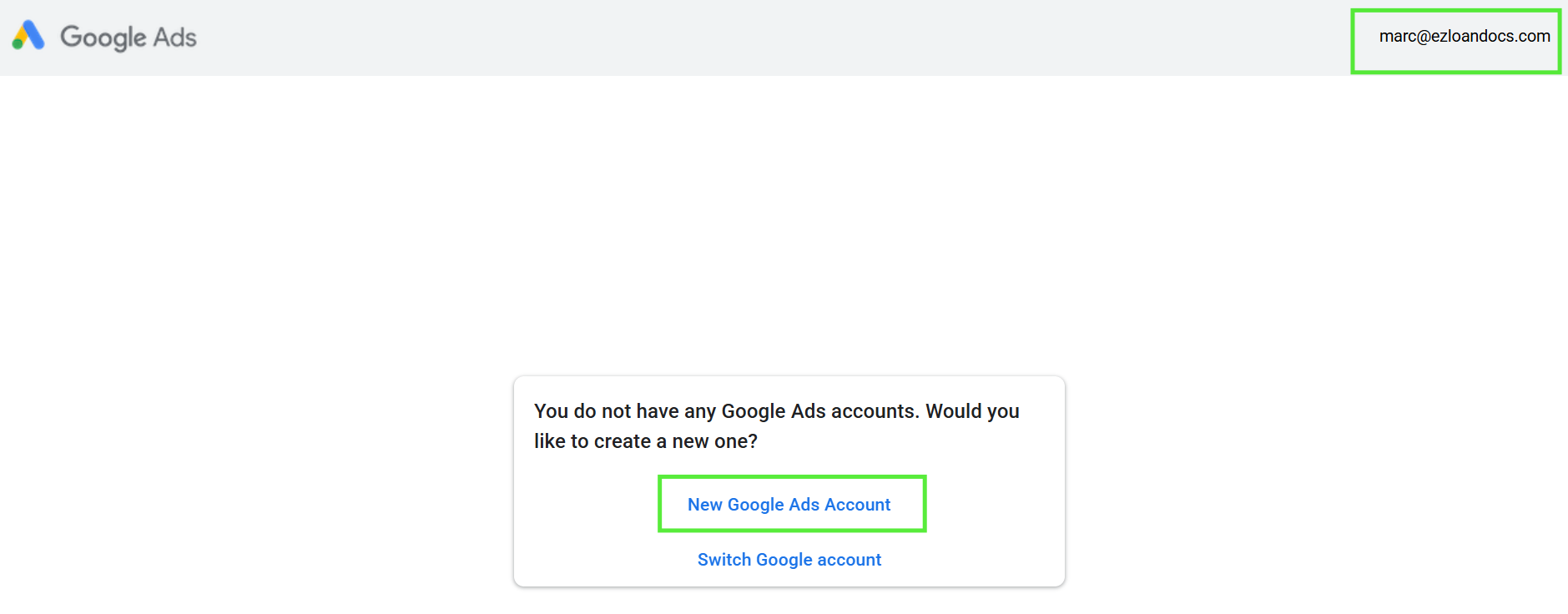 - Make sure you are logged into the right Google account. If correct, click New Google Ads account. Otherwise, switch Google account.